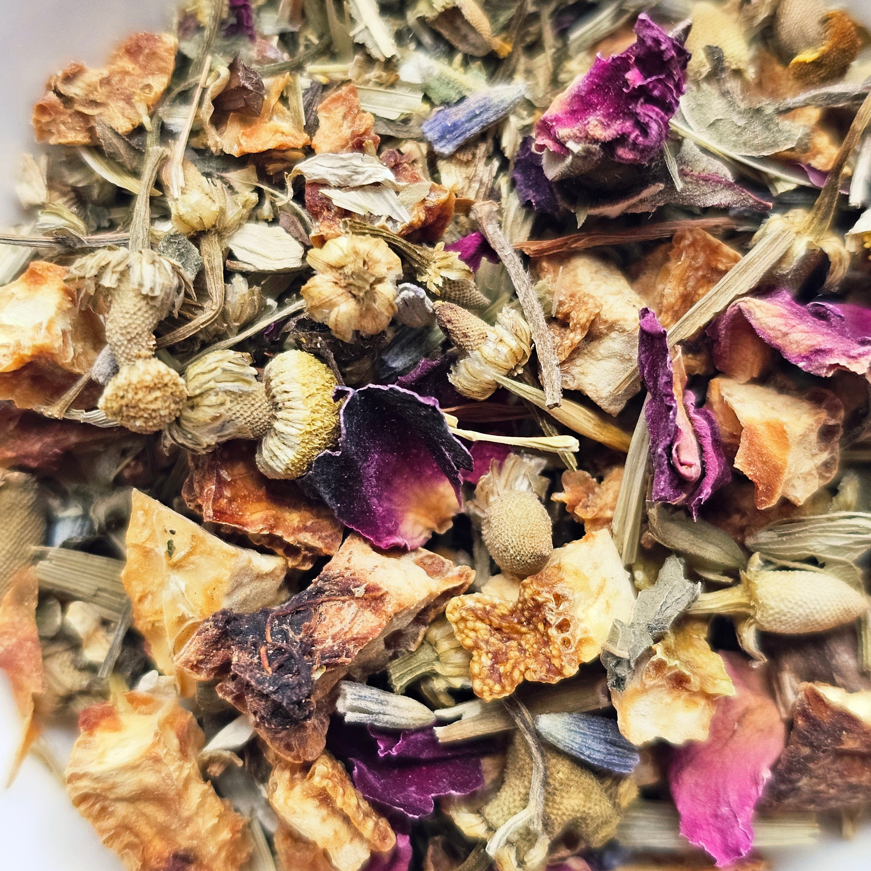 Chamomile, Rose Petals, Orange Peel, Oatstraw, Lemon Balm, Lavender, Stevia